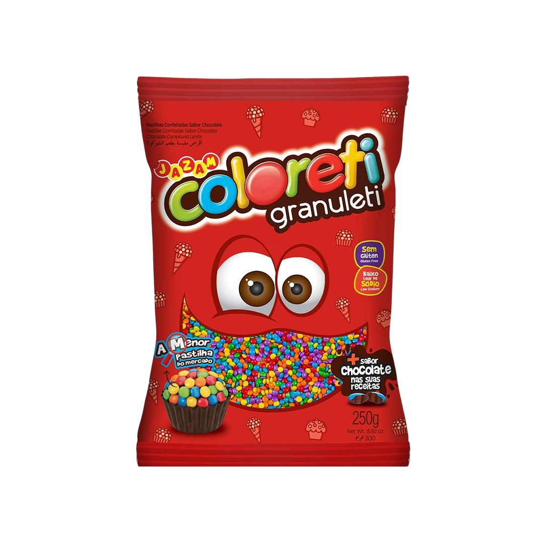 Delight in the playful charm of JAZAM COLORETI Granuleti, a vibrant assortment of chocolate mini lentils that brings a splash of color and crunch to every bite. Each 250g bag is filled with tiny, bite-sized chocolate treats, coated in an array of lively colors that add an irresistible visual appeal to your desserts and snacks.